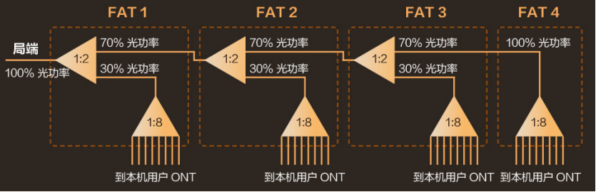 通常,將多個這種不等比分光器進(jìn)行“級聯(lián)”,如4級“級聯(lián)”(如圖2),前三個都是不等比例分光,第四個分光器是等比例分光,即局端來的光功率100%留給了FAT4本機(jī)用戶。雖然第三個、第四個分光器的局端光功率絕對值相對較小,但是,也仍然能夠滿足其本機(jī)用戶的需要。