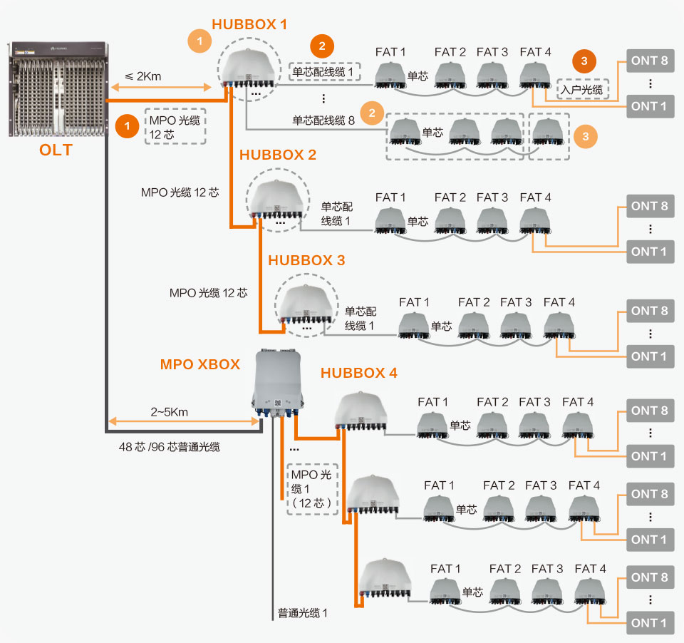 此方案(如圖9)包含三個盒子,即HUBBOX、SUBBOX、ENDBOX和三根纜,即MPO光纜、單芯配線纜、入戶光纜。每個HUBBOX對4個GPON口的纖芯進(jìn)行1:2分光,輸出8條鏈路。SUBBOX是不等比分光,可級聯(lián)4個FAT,每個FAT可連接8個用戶。離OLT較遠(yuǎn)的區(qū)域可用普通光纜+MPO XBOX方案,XBOX不僅可以直接與12芯預(yù)連接光纜相連,還可以與普通光纜連接輸出。方案全程預(yù)連接,非常適合架空場景,安裝效率高、故障率低。