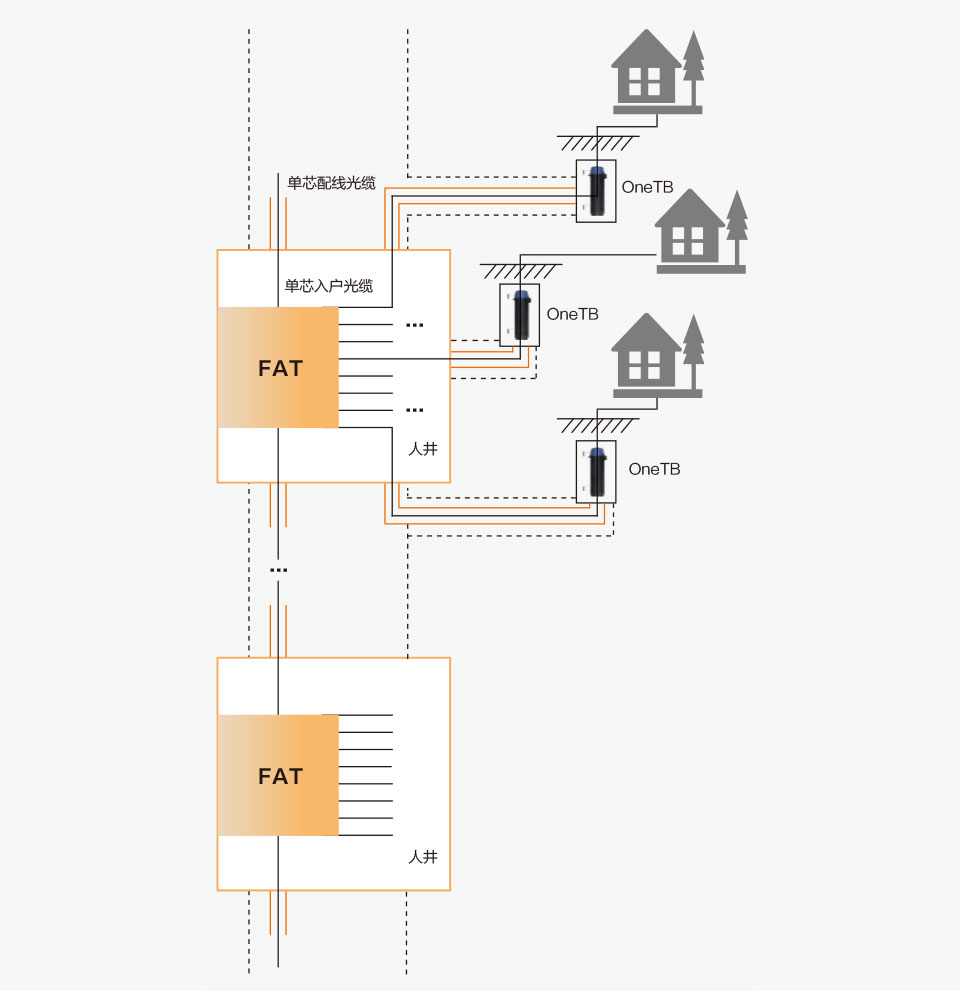 圖12中FAT為第二級分光器,建議安裝在人井的壁上,可根據(jù)住戶的密集程度選用8端口FAT或4端口FAT,F(xiàn)AT至用戶住址采用預(yù)連接方式,在用戶門口(墻外)布放OneTB(地平面之下)。FAT至OneTB采用預(yù)連接光纜可與配線段光纜同溝縱向布放,此段預(yù)連接光纜可外加一層保護(hù)管,到用戶門口位置再橫向挖溝,與OneTB相連。