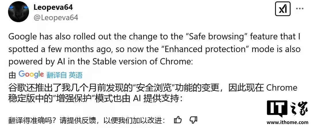 IT之家 2 月 17 日消息,消息源 @Leopeva64 昨日(2 月 16 日)在 X 平臺發(fā)布推文,稱在經(jīng)過 3 個月的 Canary 頻道測試后,谷歌 Chrome 瀏覽器穩(wěn)定版已全平臺上線全新“增強(qiáng)保護(hù)”(Enhanced protection)功能,在現(xiàn)有功能基礎(chǔ)上,通過 AI 實(shí)時防護(hù)危險網(wǎng)站、下載和擴(kuò)展程序等。